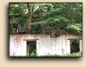 foundations for several other buildings, mostly overgrown with weeds.